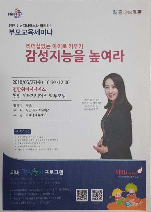 미래엔에서 개최하고 천안 위버지니어스가 함께하는 남기원 교수님의 부모교육 세미나가 6월 27일 수요일에 있습니다~ 많은 참석 부탁드립니다~^^
