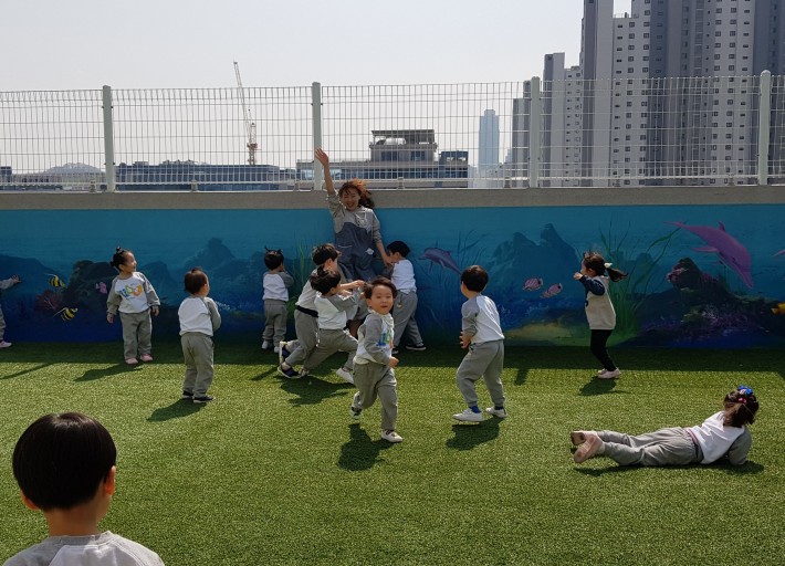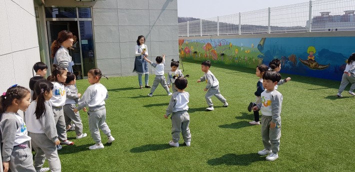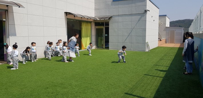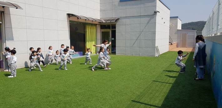 "무궁화꽃이 피었습니다" 외치는 소리에 우리 모두 얼음이되었어요~^^ 위버에서 친구들과 신나게 뛰어노는 바깥놀이 시간~