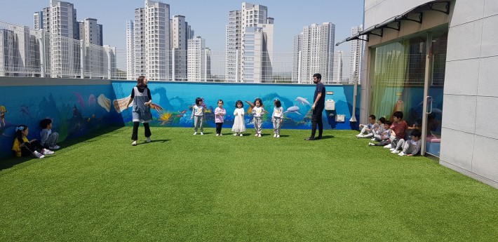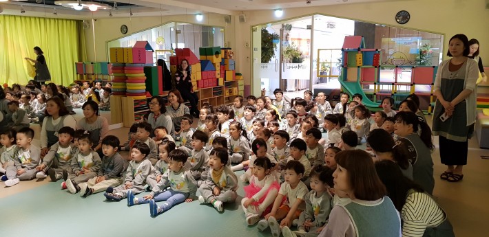 축구장에서 달리기와 비누방울 놀이를 Gym실에서는 터널 통과하기 공나르기등 친구들과 신나는 경기를 마치고 오후에는 아기염소 일곱마리 인형극을 관람했어요~^^