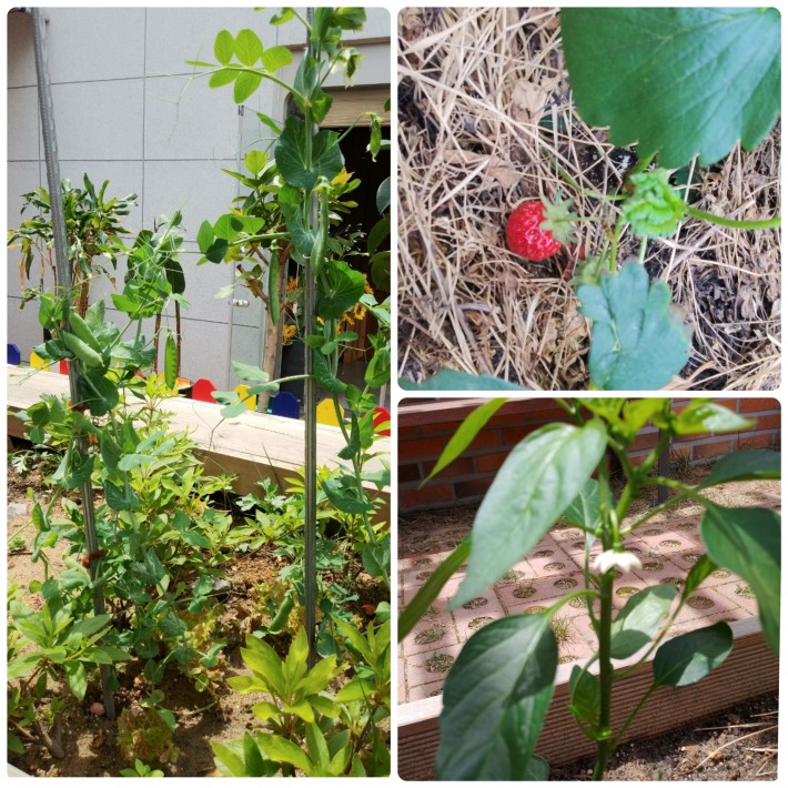 빨갛고 노란 꽃들이 자태를 뽐내고~여러 식물들이 열매를 맺고 키우며 바쁜 일과를 보내고 있네요~ 예쁘게 자라고있는 딸기와 완두콩, 고추 꽃 등을 보며 우리 위버 친구들~ 행복한 하루를 보냅니다♡