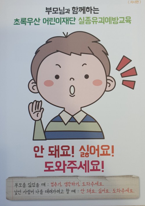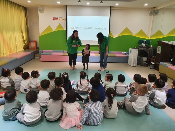 초록우산 어린이재단에서 아동실종 유괴예방교육을 하였어요. 우리 위버 친구들이 적극적으로 교육에 임하는 모습에 위기에 처해도 끄떡없이 이겨낼 수 있는 용기가 생겨났답니다. 이번 교육을 통해 자신감 쑥쑥! 기특한 위버친구들이랍니다~♡