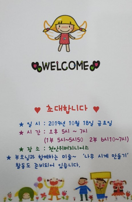 10월 18일 금요일 위버지니어스에서 가을 작은 전시회를 합니다. 그 동안 우리 아이들이 정성껏 만들고 그림을 그려 부모님들께 자랑을 하려고 합니다. 모두들 참석해 주셔서 우리 아이들의 밝은 미래와 희망찬 앞날을 응원해 주시길 바랍니다. 부모님과 함께 만드는 '시계만들기' 시간도 준비되어 있습니다.~♡