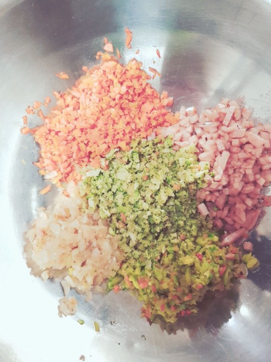 여러가지 야채와 햄을 직접 썰어보지는 못하였지만 준비된 야채들과 밥&김가루를 섞어도 보고 동그랗게 조물~~조물 만들어 보았어요^^