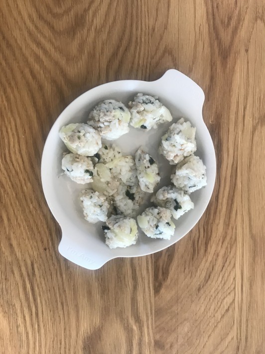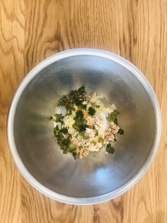미션 수행을 위해 집에 있는 돼지고기 다짐육, 잔멸치볶음, 채소들을 넣고 주먹밥을 만들었어요.