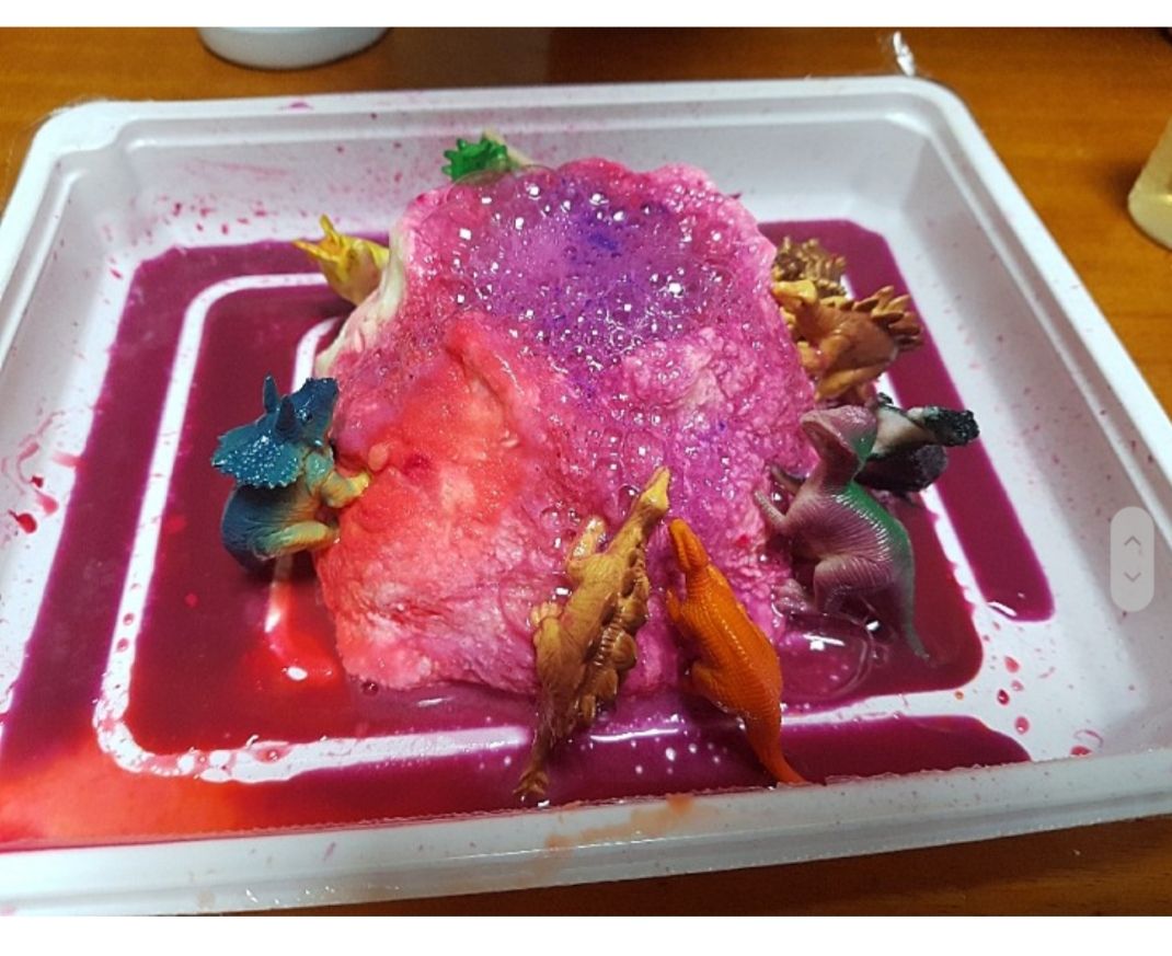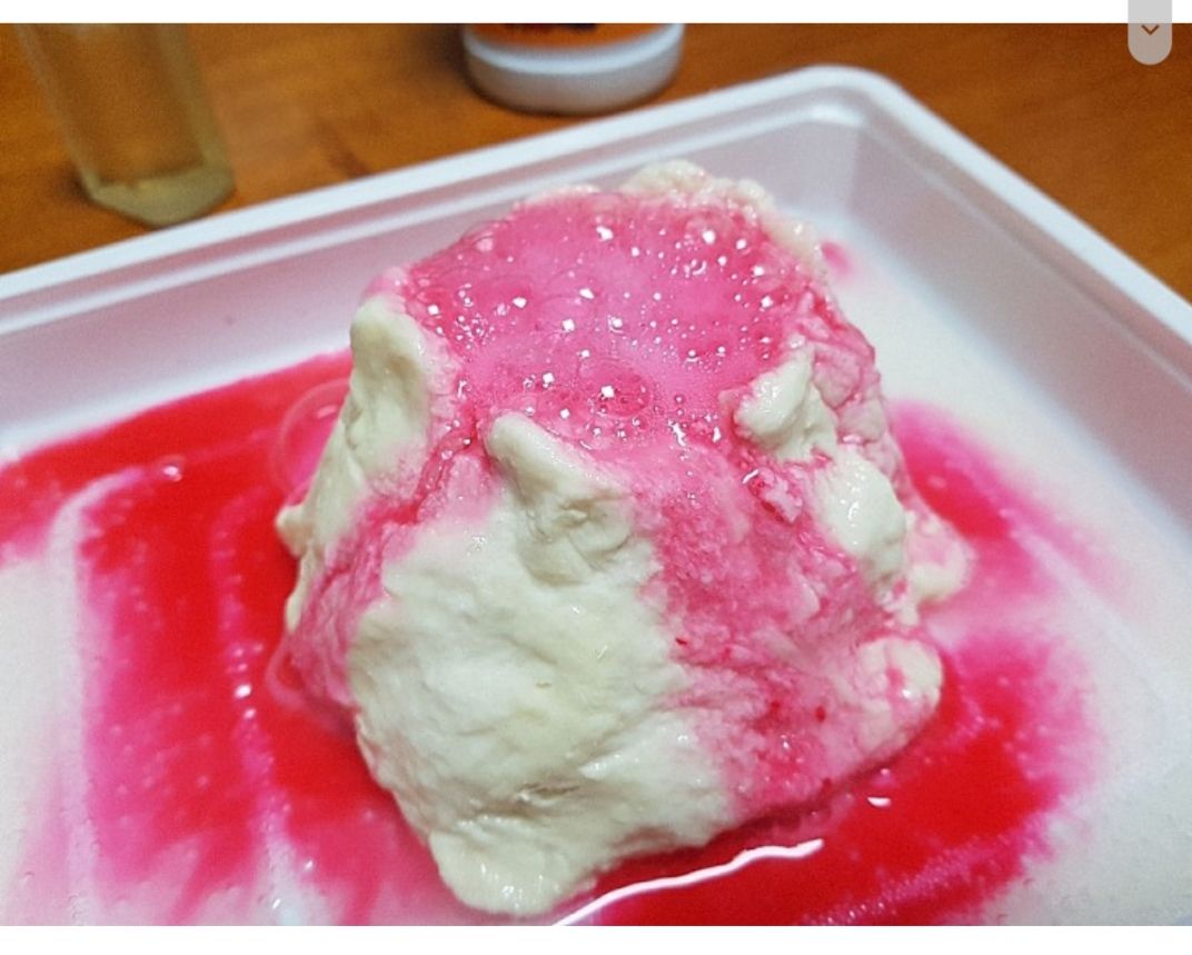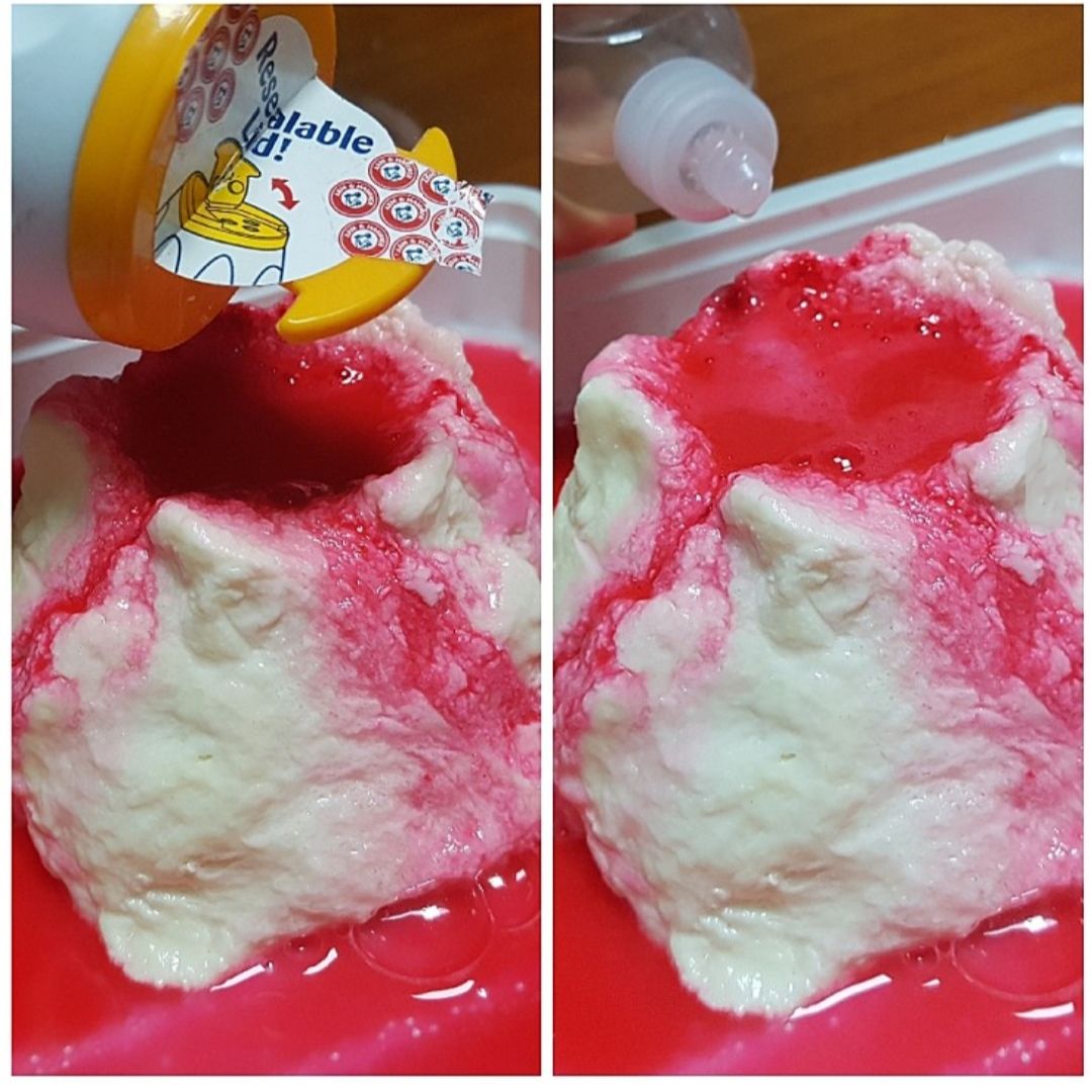 밀가루 반죽을 만들어 화산 모양의 틀을 만들어 홈에 좋아하는 색의 물감을 넣고 베이킹소다와 식초를 넣으면