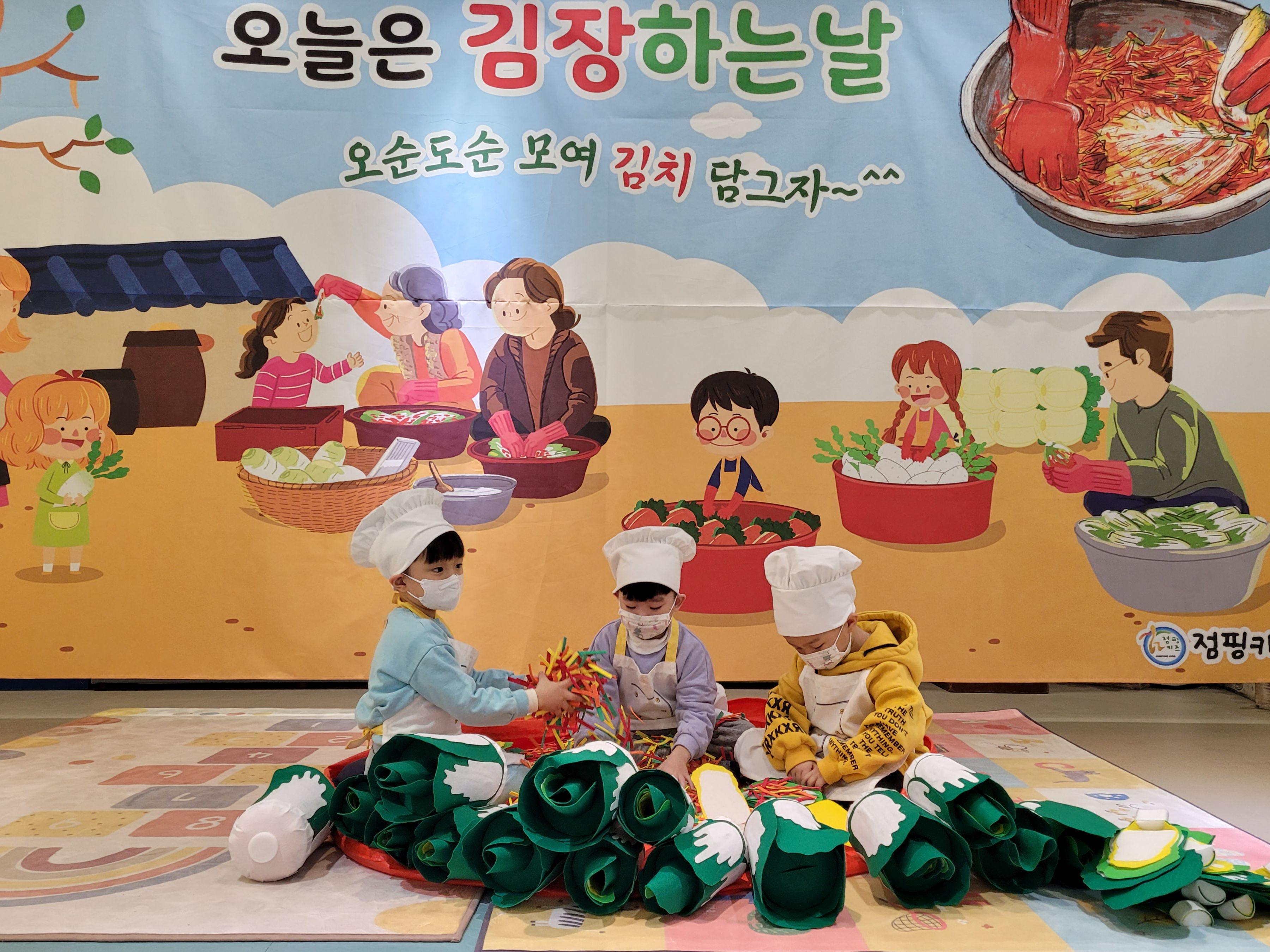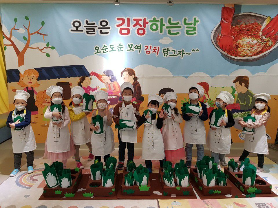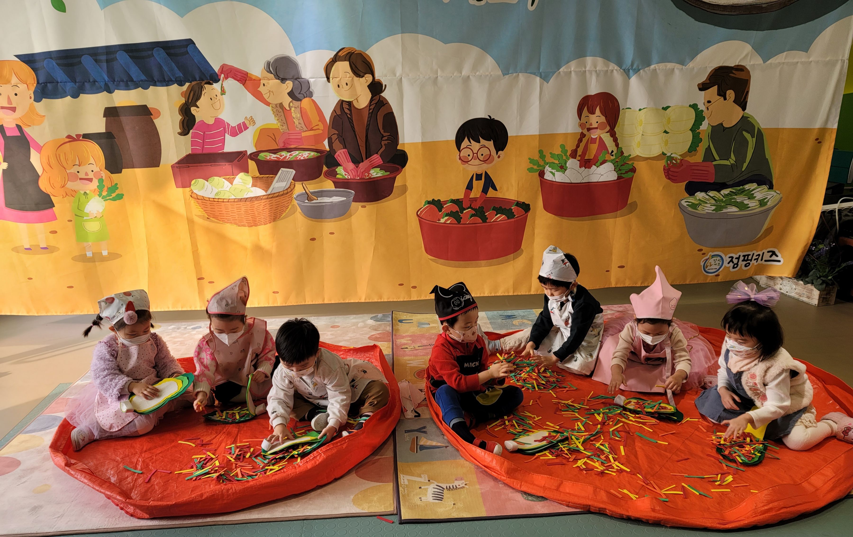 우리나라 전통행사인 김장을 위버친구들과 놀이로 체험해 보았어요.고사리같은 손으로 무도 잘라보고 배추속도 넣는 모습들이 너무나도 사랑스럽네요 ~^^