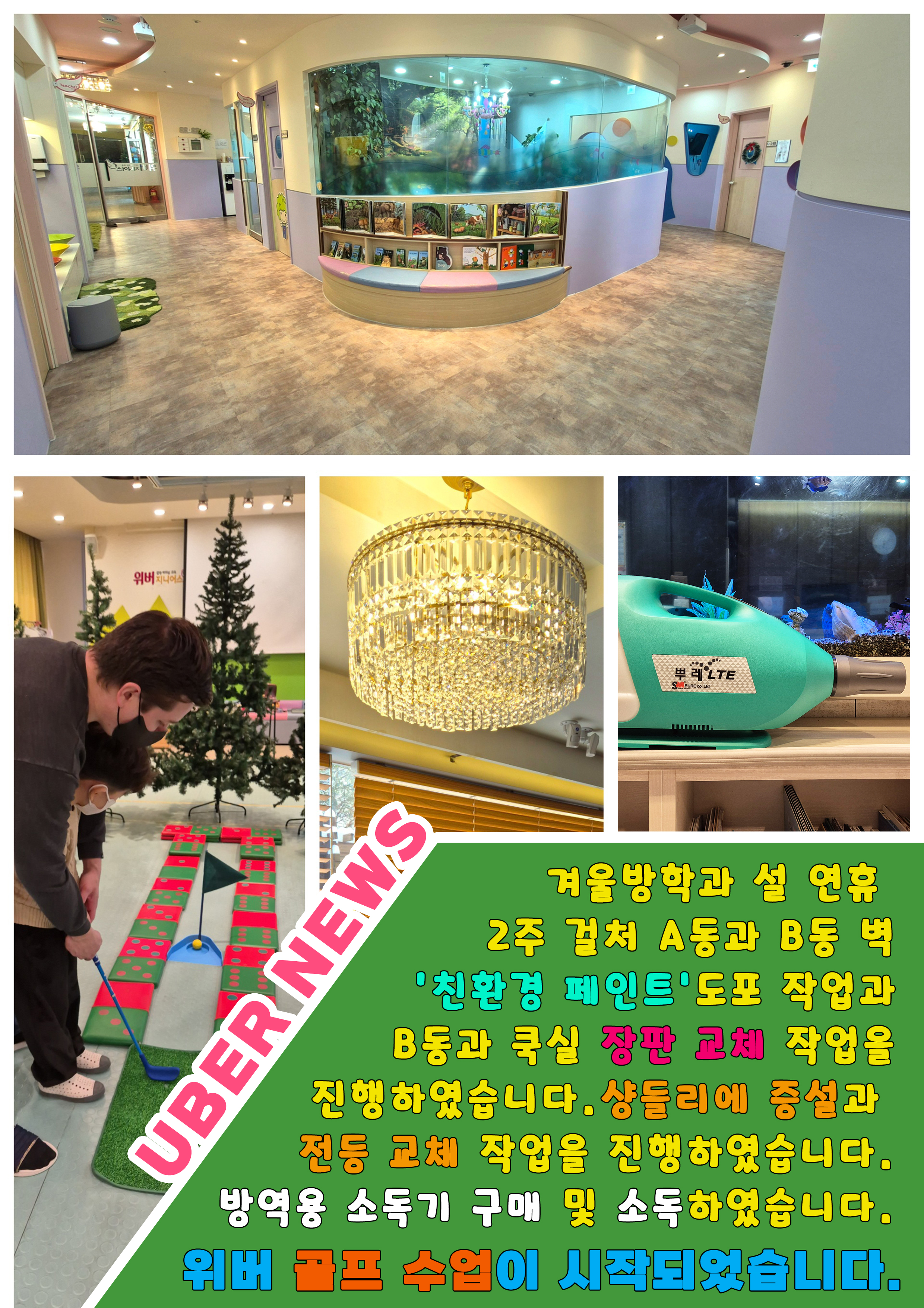 위버가 좀더 쾌적한 공간으로 새롭게 리모델링을 했습니다. 방역소독은 물론 "English Golf" 수업도 흥미로워요!!