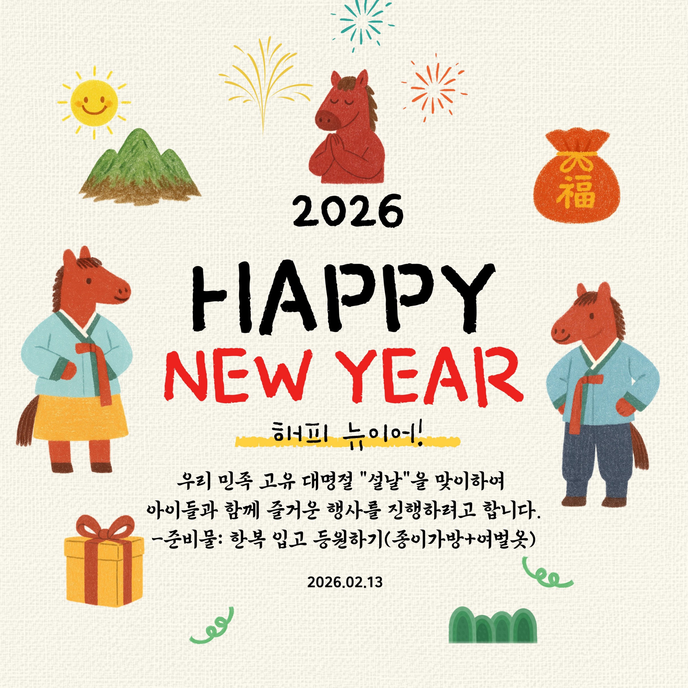 2월 13일 즐거운 설날 행사가 있습니다. 우리 민족 고유 대명절 "설날"을 맞이하여 아이들과 함께 즐거운 행사를 진행하려고 합니다. 아이들이 직접 체험하며 설을 즐겁게 누릴 수 있는 시간이 될꺼에요.